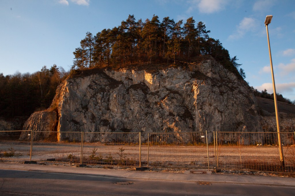 Rock face next to the Schwenk Zement limestonequarry in Blaustein, Germany.This place is located between Blaubeuren und Ulm. Without having had any specific interaction with this location its shapes and colours are manifest in my mind. The route was be a regular travel in my childhood for weekend activities. Years later I would film at another Schwenk quarry in the region and understand better the significance of limestone for the industry, as well as the consequences of the intense extraction throughout centuries (complex animals). While the prehistoric sites in this landscape where also part of my chidhood imaginarium I start to grasp now the vast effect that the findings in nearby caves and open-air sites had and have on human Selbstverständnis.